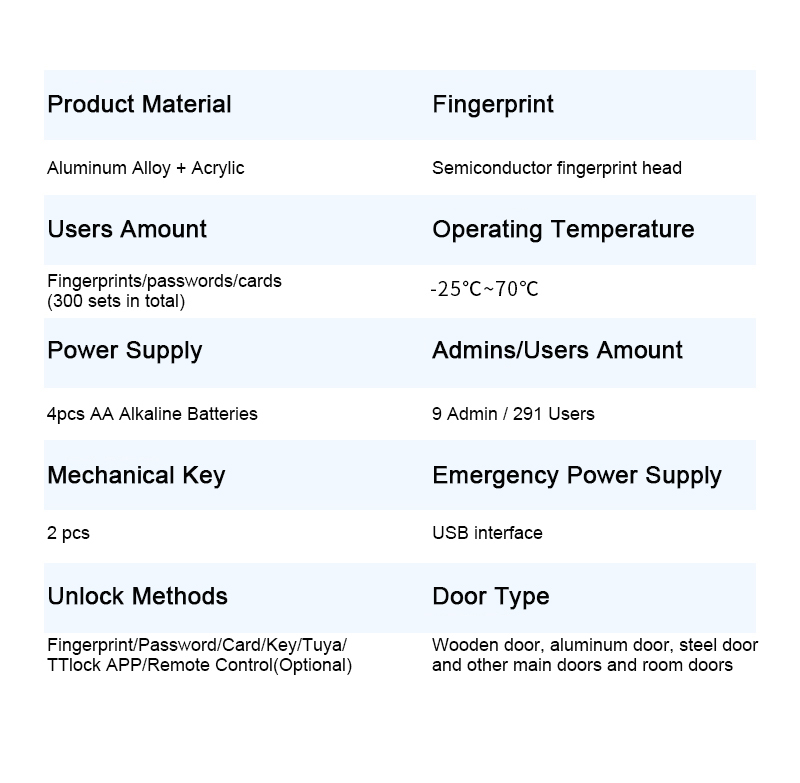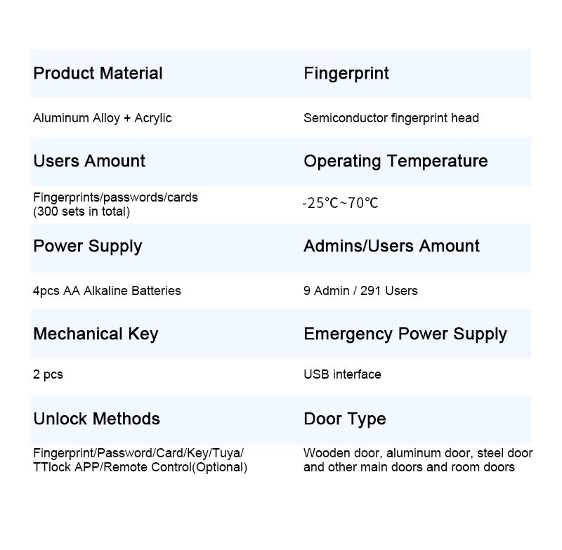 | روش باز کردن | برنامه قفل وای فای تویا، رمز عبور، اثر انگشت، کارت، کلید، پورت USB |