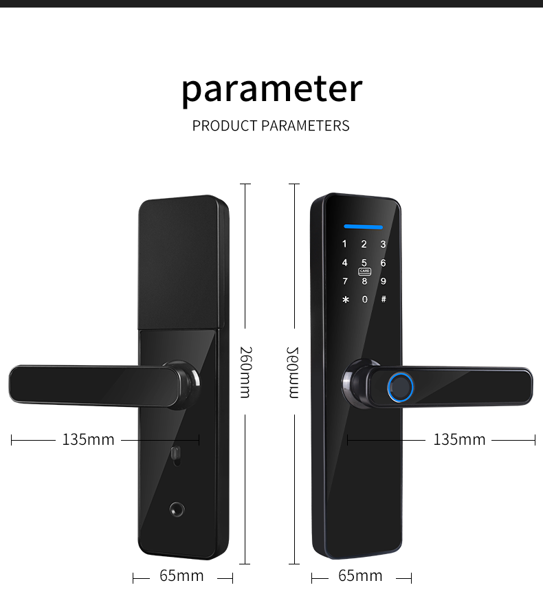 امنیت و مدیریت:آژیر ضد دخول / باز کردن خشونت آمیز ، قفل کردن با خطای رمز عبور ، یادآوری درب باز / باز کردن قفل ، قفل خودکار ، ذخیره سازی ابر / محلی سوابق باز کردن قفلمدل های تجاری از مجوزهای سلسله مراتبی و گزارش حضور پشتیبانی می کنند.