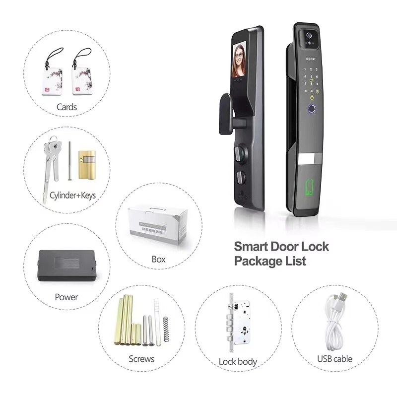قفل درب هوشمند آلومینیومی پیشرفته با تشخیص چهره سه بعدی، اسکن اثر انگشت و روش های دسترسی چندگانه با اتصال وای فای تویا برای کنترل از راه دور.