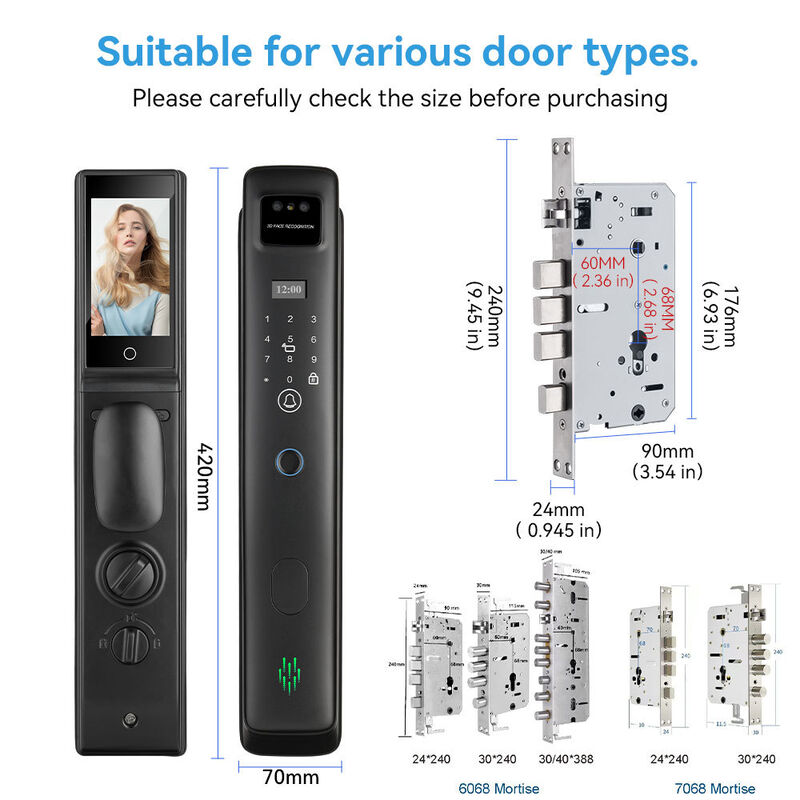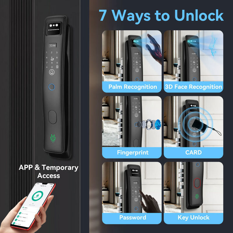 | سطح سیلندر قفل: | سیلندر قفل ایمنی کلاس C | راه های باز: | صورت سه بعدی + رگ کف دست + تماس تصویری فعال + گذرواژه + کارت + کلید + برنامه Tuya |